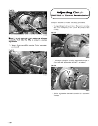 Clean the ATV thoroughly. These four-wheelers outperformed the competition and literally played in slush and mud. The manual is designed to aid service.